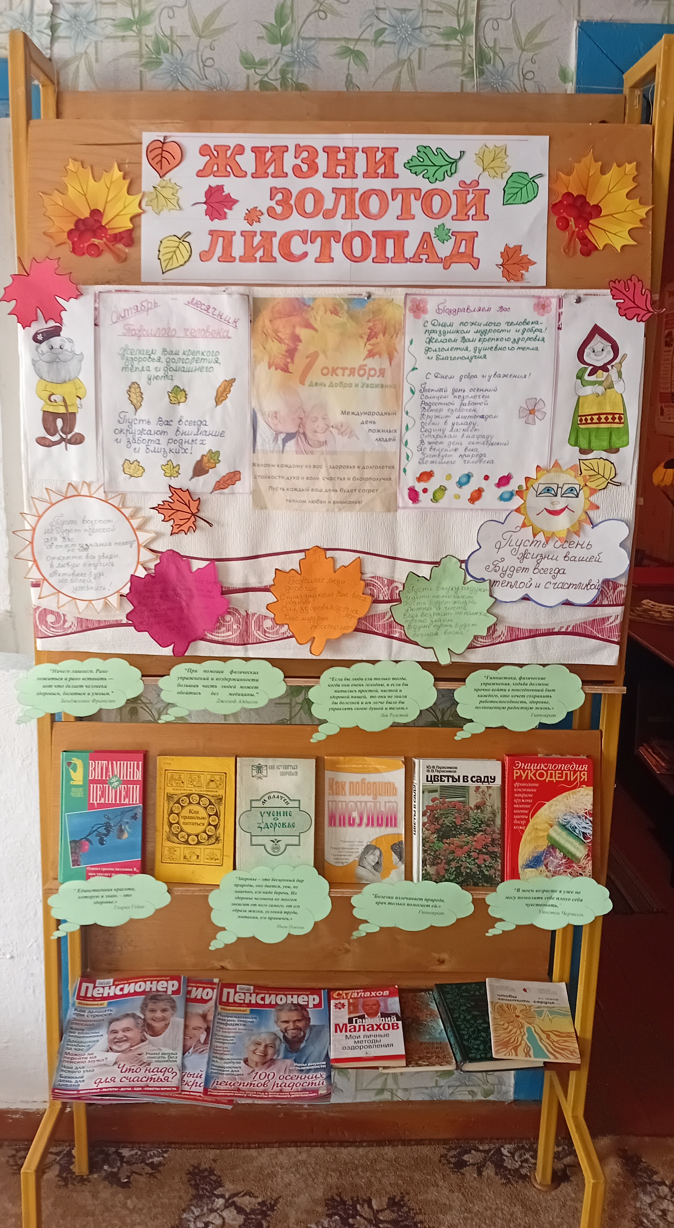 1 октября Международный день пожилых людей. Во всем мире с глубоким почтением относятся к пожилым людям. В сознании каждого из нас – сделать так, чтобы жизнь их была наполнена теплым общением. Неслучайно он отмечается осенью в пору листопада, когда все в природе полнится очарованием тишины, навевает мысли о мудрости и зрелости. К этой дате в Желаньинской поселенческой библиотеке оформлена книжно-иллюстративная выставка «Жизни золотой листопад». Люди старшего поколения, воспитанные книгой, остаются верны ей на протяжении всей жизни. На выставке представлены книжные пристрастия своих читателей: это издания о здоровом образе жизни, секретах долголетия и активной жизненной позиции, вязание и ведение хозяйства.