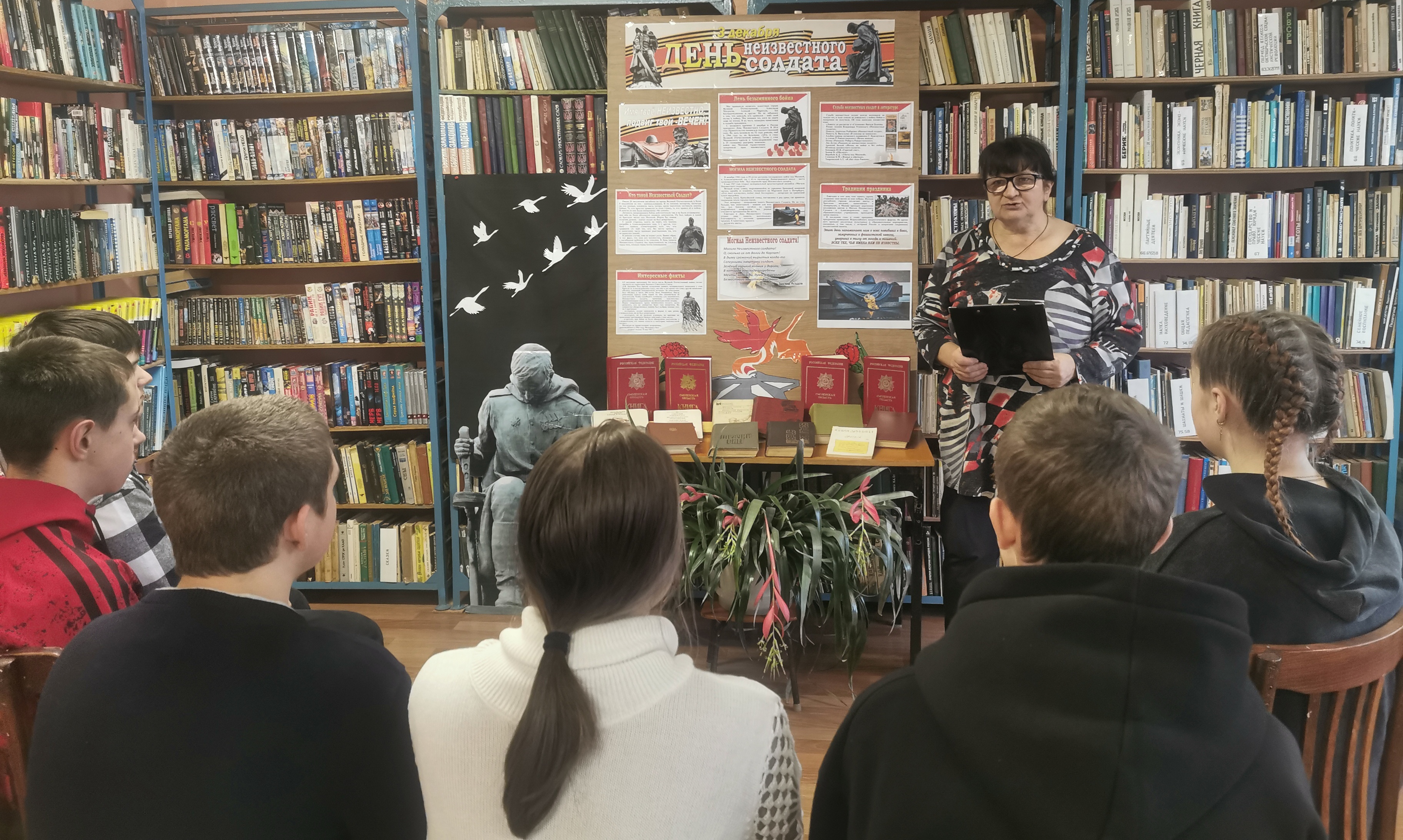 В Русановской поселенческой библиотеке проведён час мужества «Имя твоё неизвестно, подвиг твой бессмертен», посвященный подвигам настоящих героев. Юные участники встречи узнали об истории возникновения этой памятной даты, о Могиле Неизвестного Солдата – мемориальном комплексе у Кремлевской стены в Александровском саду. Библиотекарь также рассказала о памятнике Неизвестному солдату в селе Угра и расположенном там солдатском захоронении. В рамках мероприятия прозвучали стихотворения М. Исаковского, А. Твардовского, Ю. Друниной, К. Симонова, Р. Рождественского, посвященные подвигу русских солдат, не вернувшихся с войны. Память о безымянных защитниках будет жить, пока мы её храним.
