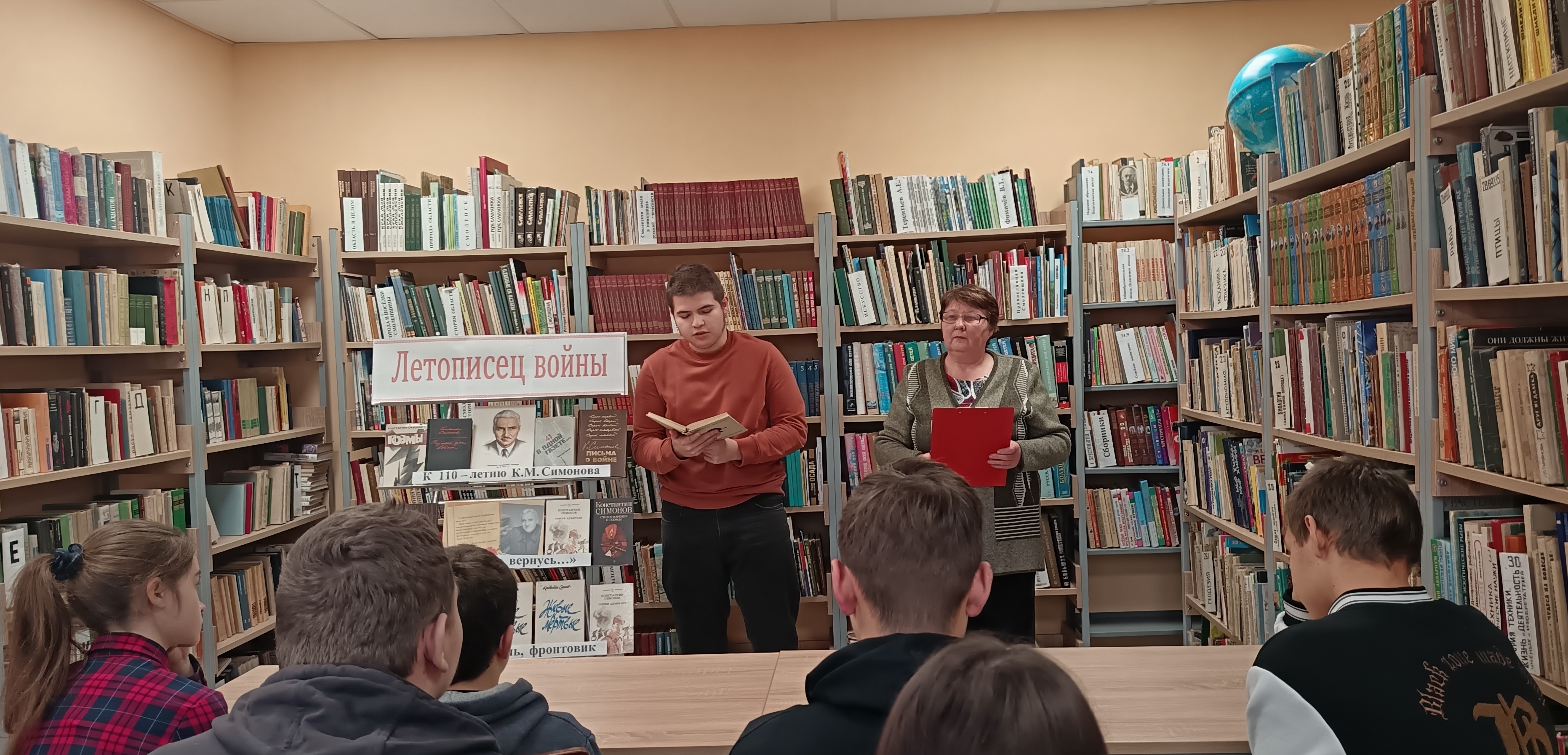 В центральной детской библиотеке прошёл литературно – краеведческий час «Смоленщина в творчестве Константина Симонова», на котором читатели узнали, что значила для К.Симонова Смоленщина горьких военных лет. Библиотекарь рассказала присутствующим о том, что К. Симонов был военным корреспондентом, побывал на всех фронтах, прошёл военными дорогами от Москвы до Берлина, видел войну своими глазами и передавал её правду в своих произведениях.