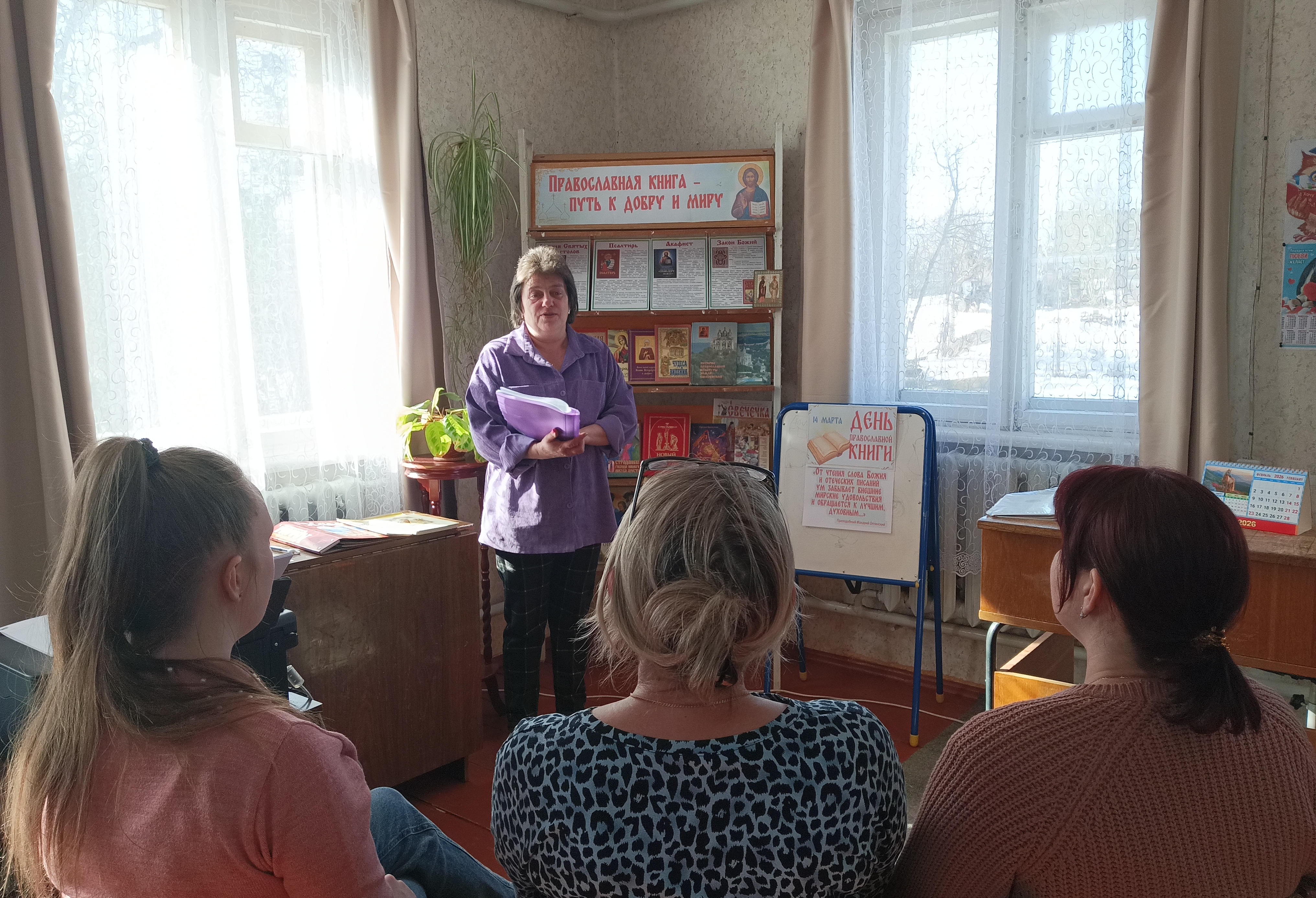 В преддверии Всероссийского Дня православной книги библиотекарь внестационарных форм обслуживания центральной библиотеки Апенченко И.И. провела час православной книги «Живое слово мудрости духовной» для участников клуба «Золотого возраста». Ведущая рассказала об истории праздника, связанного с изданием первой печатной книги на Руси «Апостол» и провела обзор одноименной книжной выставки с новинки православной литературы, в том числе современных авторов.