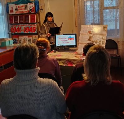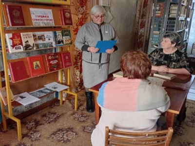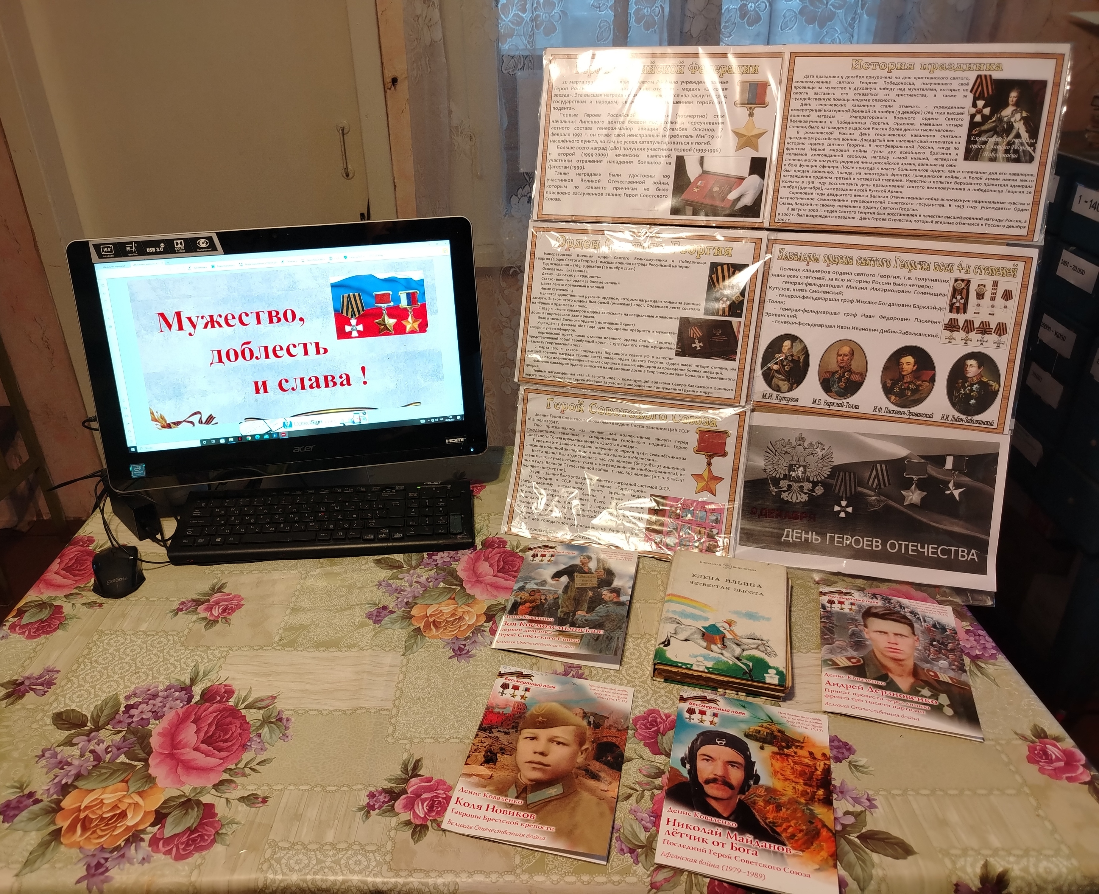 В Слободской поселенческой библиотеке состоялся патриотический час «Живы герои, пока их помнят». Библиотекарь Иванова М.С. познакомила присутствующих с историей возникновения праздника, который напрямую связан с учреждением ордена Святого Георгия Победоносца, рассказала о кавалерах ордена, о женщинах, удостоенных этой награды, и о подвиге сестры милосердия Риммы Ивановой, ставшей единственной женщиной в истории, получившей орден Святого Георгия за боевые заслуги. В ходе мероприятия прозвучали стихотворения Р. Рождественского, Р. Казакова, О. Сергеевой.