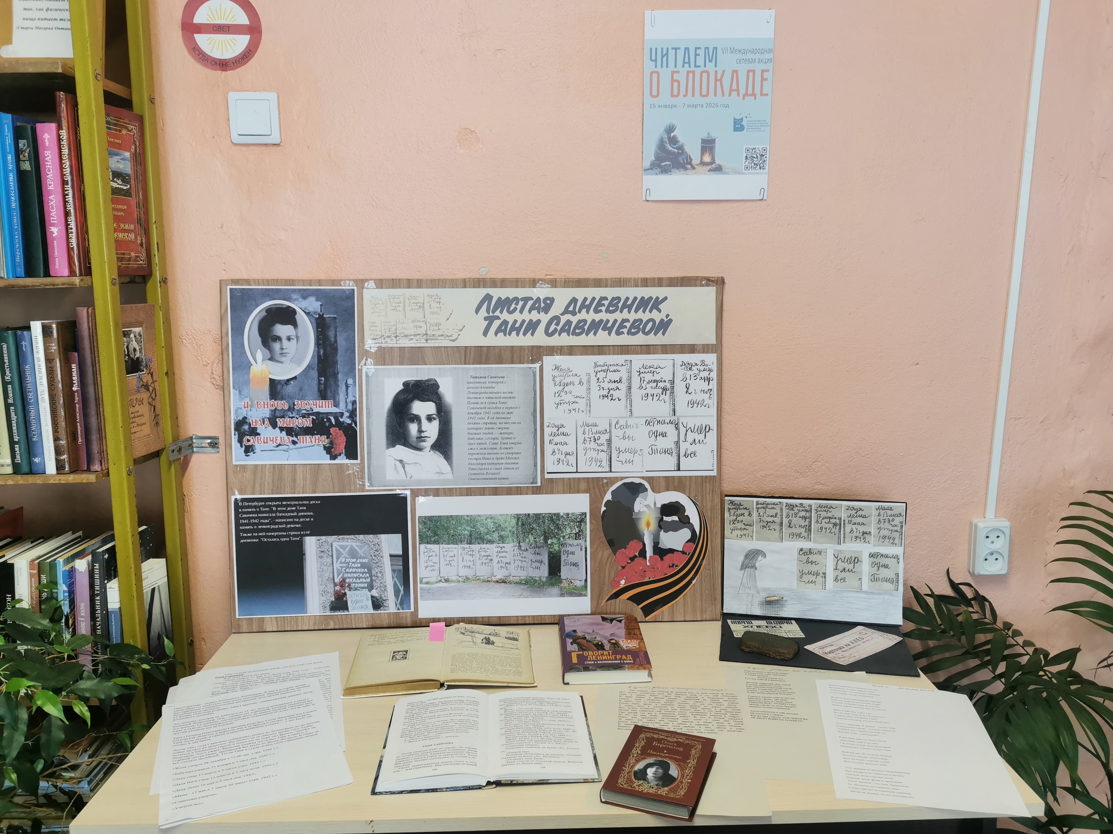 23 января в рамках VII Международной акции «Читаем о блокаде», в Единый день чтения, посвященный Тане Савичевой, во Всходской поселенческой библиотеке проведен урок памяти «Листая дневник Тани Савичевой. Библиотекарь рассказала детям о трагической судьбе ленинградской школьницы, чье имя вошло в историю и стало символом блокадного Ленинграда. Дети прочитали 9 страшных страниц из дневника Тани, в каждой – смерть одного из близких. Написанный ею дневник был приобщен к обвинительным материалам дела против нацистов на Нюрнбергском процессе. Ребята узнали о памятных местах, посвященных одиннадцатилетней блокадницы. В рамках Акции были прочитаны рассказ С.Алексеева «Таня Савичева» и стихотворение В.Жукова «Дневник Тани Савичевой». Выставка, посвященная памяти юной ленинградки не оставила ребят равнодушными.